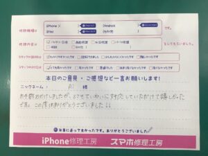 スマホ修理工房海老名ビナウォーク店/iPhoneXのバッテリー交換でお越しのお客様から頂いたお言葉
