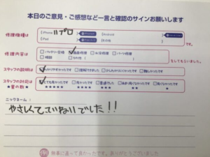 【iPhoneSE2のバッテリー交換でご来店のななし様からいただいた評価】